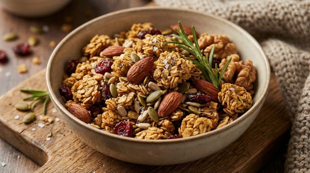 Une fois sorti du four, ce granola s’impose comme la star incontestée des débuts de soirée. Il offre une alternative originale et bien plus raffinée aux sempiternelles chips ou cacahuètes salées. Présenté dans de petits bols en céramique, il invite à la convivialité et surprend les invités par son caractère fait-maison. Les saveurs de romarin et de paprika se marient divinement avec un verre de vin blanc sec ou un jus de pomme chaud aux épices, créant un accord parfait pour les apéritifs d’hiver au coin du feu.