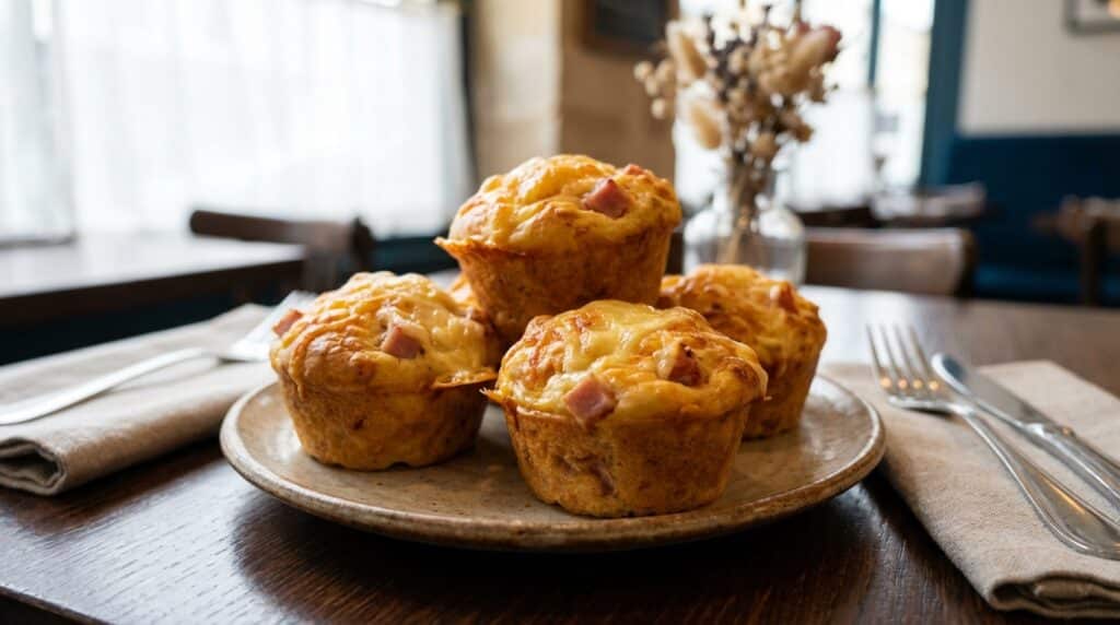 Bien que ces muffins se suffisent à eux-mêmes, les accompagner d’une touche de fraîcheur végétale permet de créer un repas complet et équilibré, parfait pour affronter le reste de la journée. En cette saison, une salade de mâche ou de jeunes pousses d’épinards, assaisonnée d’une vinaigrette moutardée aux noix, apporte un contraste croquant et poivré qui tranche merveilleusement avec la richesse du fromage et du jambon. Pour les amateurs de textures, ajouter quelques pickles maison, comme des cornichons ou des oignons rouges marinés, offre une acidité bienvenue qui réveille le palais.