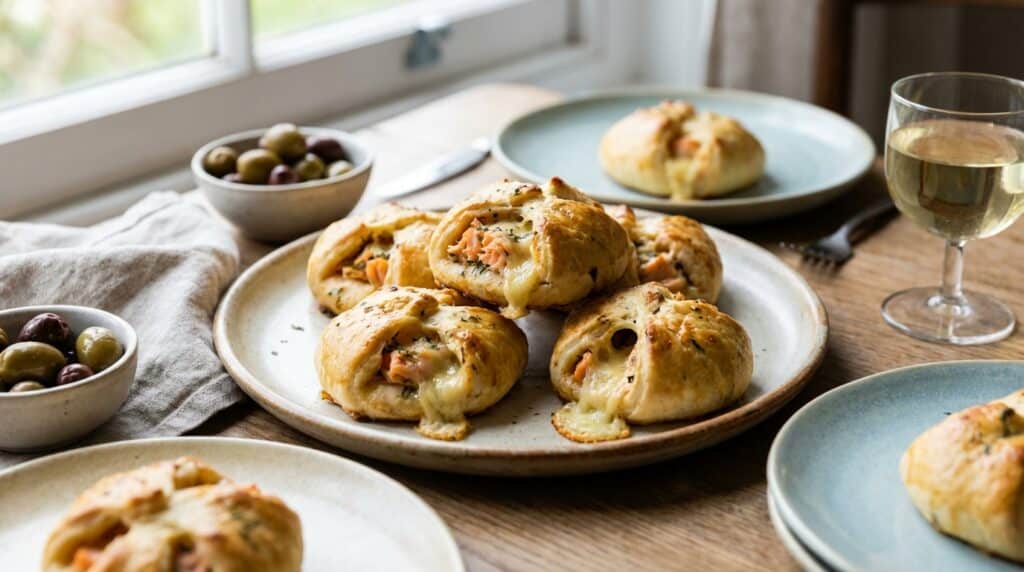 Le duo fait mouche : le saumon fumé apporte sa note iodée, tandis que le Boursin ail et fines herbes glisse une gourmandise crémeuse dans la pâte. Ce fromage frais, né en Normandie, a ce petit goût d’herbes qui rappelle les rillettes maison et les tartines généreuses.