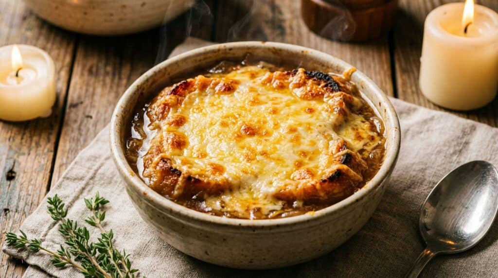 Quand les soirées un peu fraîches du printemps tombent et que le besoin de réconfort appelle formellement vers la table, rien ne vaut un plat authentique mijoté avec tendresse. Ces jours-ci, le plaisir de plonger une cuillère gourmande dans un bol fumant surpasse largement toutes les recettes compliquées. Imaginez un récipient brûlant d’où s’échappe un doux parfum de bouillon corsé, majestueusement couronné d’une épaisse croûte fromagère irrésistible. Derrière ce gratin doré qui crépite à peine sorti du four, se cache une soupe à l’oignon gratinée d’une douceur absolue. Parfaite pour clore une journée printanière capricieuse, cette création rustique métamorphose des produits très modestes en un festin d’une chaleur inégalable, offrant directement aux papilles un voyage fabuleux, entre textures fondantes et arômes véritablement envoûtants.