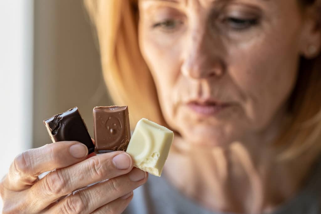 - Privilégier le chocolat noir à plus de 70 %, qui, grâce à son intensité, satisfait plus rapidement et incite à des portions plus petites que le chocolat blanc ou au lait.