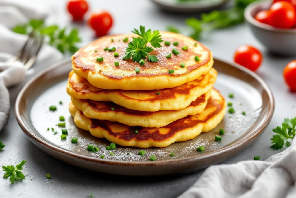 À la saison froide, l’envie de varier les plaisirs s’impose. Essayez la version fromage râpé (emmental, cantal, ou même bleu persillé) pour des pancakes au cœur filant, parfaits pour les dîners d’hiver. Remplacez les herbes fraîches par de l’oseille ou de la coriandre pour une note plus acidulée ou exotique, ou ajoutez quelques dés de saumon fumé ou de jambon pour une touche festive qui s’invite à l’heure du brunch ou de l’apéritif.