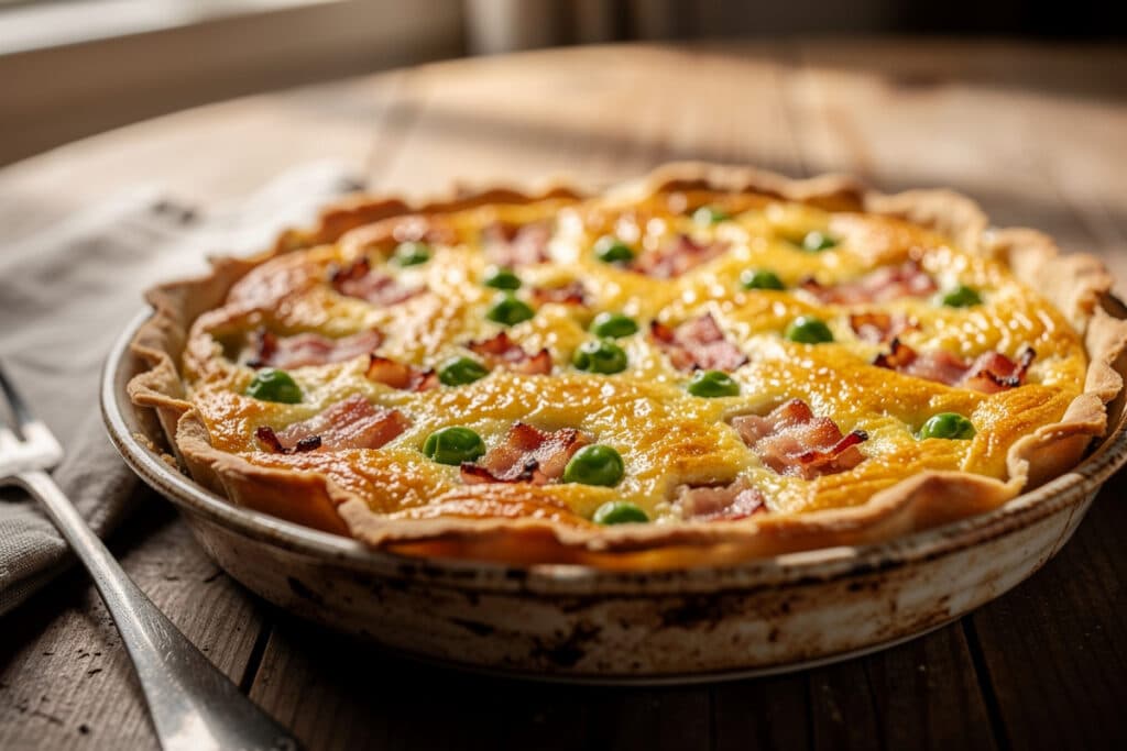 Préchauffer le four à 200 °C. Dans un grand saladier, casser les œufs puis les battre fermement avec la farine pour obtenir une pâte bien lisse : ce mélange garantit une tenue parfaite à la découpe. Verser le lait en filet en continuant de fouetter : la préparation s’éclaircit et devient onctueuse. Ajouter ensuite les lardons ou les dés de jambon, les petits pois, une pincée de sel, de poivre et, selon l’envie, un nuage de noix de muscade fraîchement râpée. Pour plus de gourmandise, incorporer une poignée de fromage râpé, mais sans excès pour garder la légèreté de la recette.