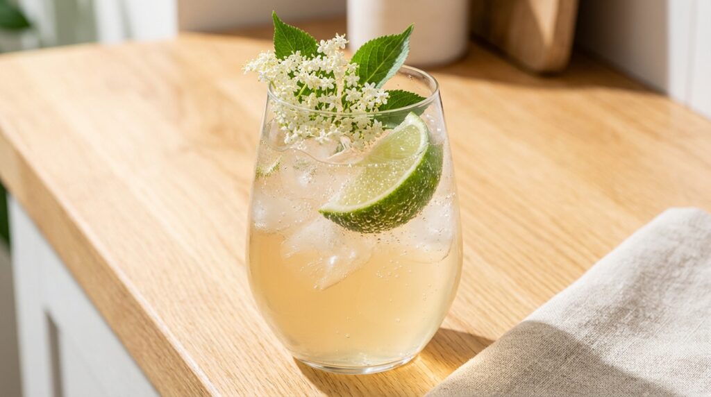 Le prosecco forme la base pétillante, la liqueur de sureau apporte ses parfums floraux délicats, et l’eau pétillante vient alléger l’ensemble. Le citron vert donne la touche d’acidité vivifiante, pendant que la menthe s’invite pour la fraîcheur.