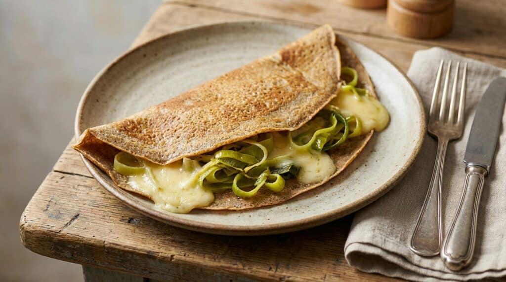 L’équilibre entre le fondant de la garniture et le croustillant des bords de crêpe repose largement sur les proportions. Deux cents grammes de comté pour trois poireaux moyens, c’est la proportion clé qui permet au fromage de se faire discrètement gourmand sans écraser les autres saveurs. Trop de fromage rendrait le plat lourd, pas assez le laisserait faiblard.