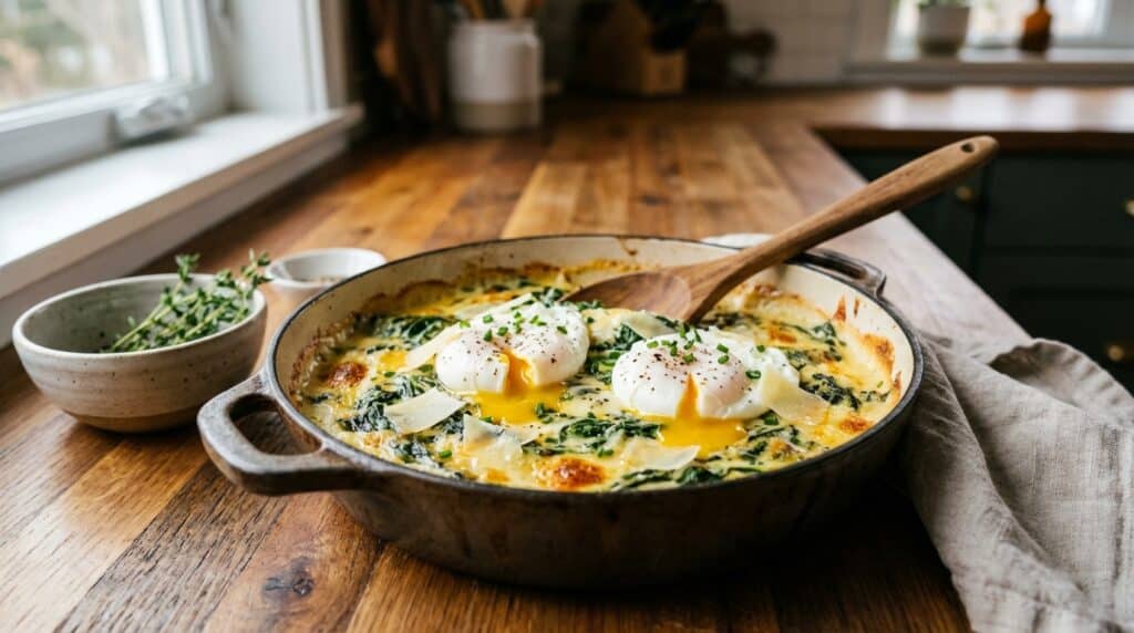 Ce plat fonctionne aussi parce qu’il joue sur l’inattendu. On annonce un gratin d’épinards et on reçoit un plat qui regarde plus du côté des œufs mollets au four, de la richesse crémeuse. Les épinards restent en arrière-plan, suffisamment discrets pour ne pas déranger, suffisamment présents pour apporter leurs minéraux et leur texture. C’est du camouflage culinaire réussi, celui où tout le monde sort gagnant.