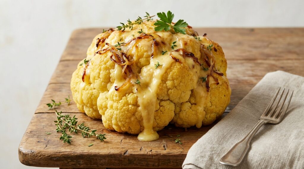 Quand les soirées réclament du chaud et du réconfortant, un plat arrive à table et fait instantanément monter le volume des “oh” et des “mais non, c’est quoi ça ?”. Une belle forme ronde, une surface bien dorée, presque comme une pâtisserie salée. À la découpe, la lame glisse dans une matière souple, et le cœur s’affaisse juste ce qu’il faut : un fondant qui rappelle un gâteau tout juste sorti du four. Sauf qu’ici, la star n’a rien d’un dessert : c’est un chou-fleur entier, rôti puis emprisonné dans un appareil aux œufs, parfumé au curcuma, adouci par des oignons caramélisés, et réveillé par des herbes fraîches. Le genre de recette qui fait parler avant même la première bouchée.