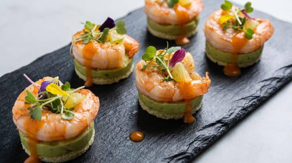Les tartines à l’avocat connaissent ici une métamorphose festive : une base de baguette chaude et dorée, une crème d’avocat assaisonnée de citron vert et de piment doux pour l’exotisme, puis une crevette délicatement posée pour la gourmandise marine. Ne négligez pas la touche finale : un zeste de citron vert râpé au dernier instant, pour enflammer les sens. Une bouchée croquante, fondante et piquante, idéale pour ouvrir la danse des saveurs. Le pain se teinte de vert, la crevette s’invite sur son trône et chaque toast devient une promesse d’évasion, à partager entre amis autour d’un bon verre.