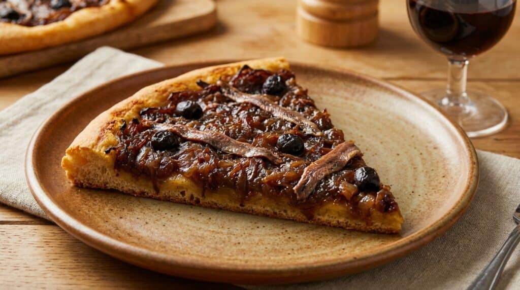 La répartition des oignons confits doit se faire de manière égale sur toute la surface de la pâte, en laissant un petit bord libre. Vient alors l’étape artistique : on dispose les filets d’anchois en formant des croisillons sur le lit d’oignons. Cette disposition en losanges n’est pas seulement esthétique, elle assure une répartition équilibrée du goût salé à chaque bouchée. Au centre de chaque losange, on dépose une petite olive de Nice. La pissaladière est enfournée pour 25 minutes à 220 °C, jusqu’à ce que la pâte soit bien dorée et les bords légèrement gonflés.
