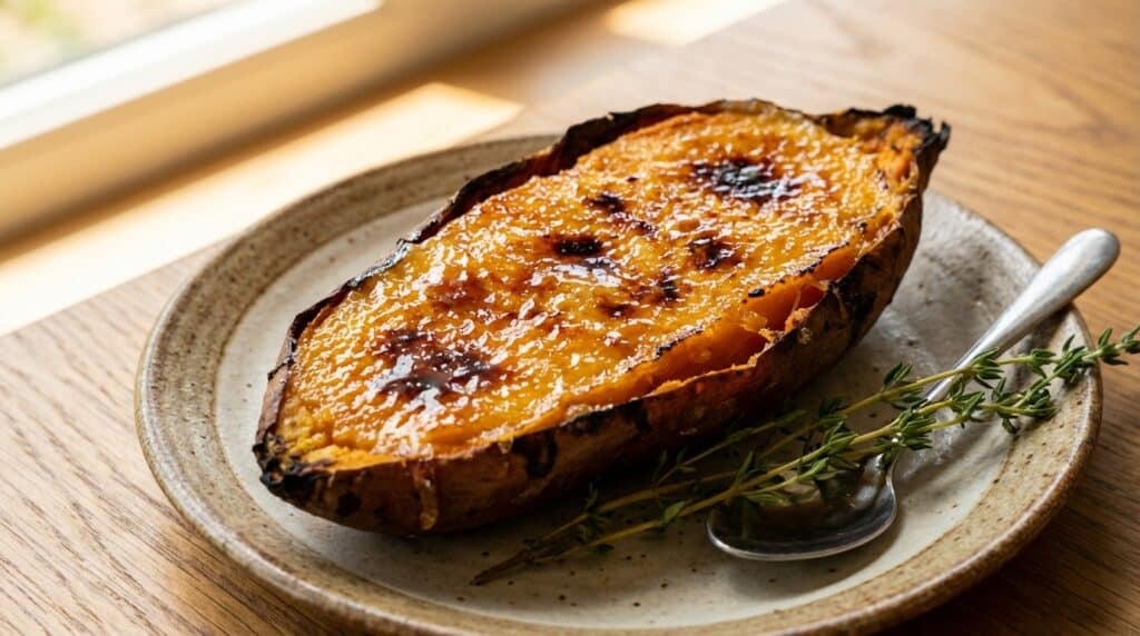 Vient ensuite le moment le plus spectaculaire du dressage. Garnissez généreusement l’ouverture des patates douces avec la crème fouettée vanillée, en lissant la surface à l’aide d’une spatule pour obtenir un dessus bien plat. Saupoudrez une couche homogène de sucre cassonade sur la crème. Armez-vous d’un chalumeau de cuisine et brûlez le sucre jusqu’à ce qu’il forme une croûte ambrée et craquante, typique de la crème brûlée. Le contraste entre le caramel brûlant et la crème onctueuse est ce qui rend ce dessert absolument inoubliable.