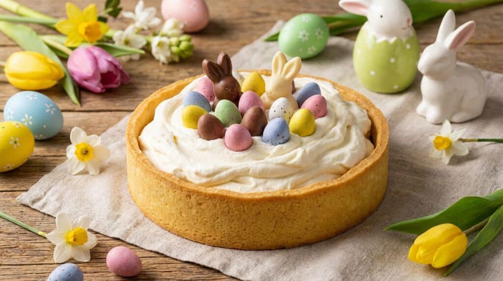 Ce qui impressionne, c’est le contraste dès la première cuillère : la pâte sablée croustille, puis la mousse fond. Le tout reste très accessible, sans matériel pro ni geste compliqué, juste des étapes claires. L’effet “waouh” arrive grâce aux textures opposées et à une déco de Pâques immédiatement reconnaissable.