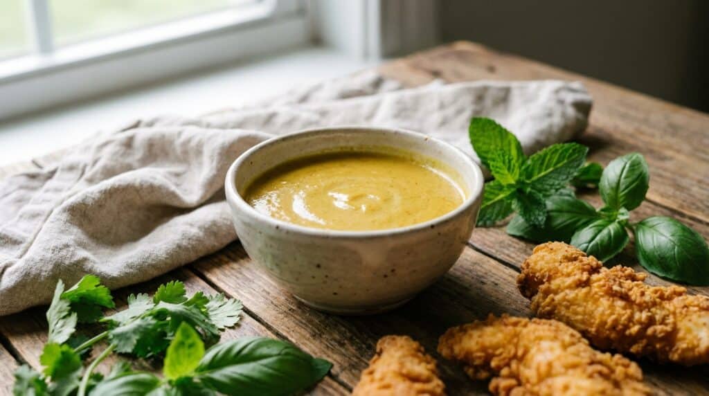 Cette sauce appelle les classiques de la comfort food. Elle nappe divinement des nuggets de poulet maison panés aux cornflakes pour un croustillant inégalable, ou accompagne des frites de pommes de terre rustiques cuites au four avec la peau. Le contraste entre le chaud des fritures et la fraîcheur onctueuse de la sauce crée une expérience sensorielle gourmande à souhait.
