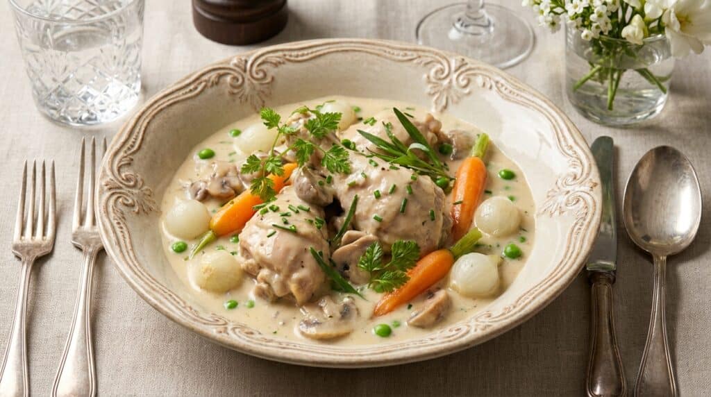 Veiller à ne pas faire bouillir la sauce liée au jaune et à la crème permet d’obtenir une texture veloutée et brillante sans grumeaux ni caillage. Préférer des morceaux de poulet fermier garantit une chair tendre qui ne se dessèche pas à la cuisson. Pour renforcer le parfum, il suffit d’ajouter une pincée de noix de muscade fraîchement râpée ou une pointe de zeste de citron – la fraîcheur fait toute la différence, surtout en hiver. Enfin, quelques feuilles de persil haché apportent une touche éclatante au dernier moment.