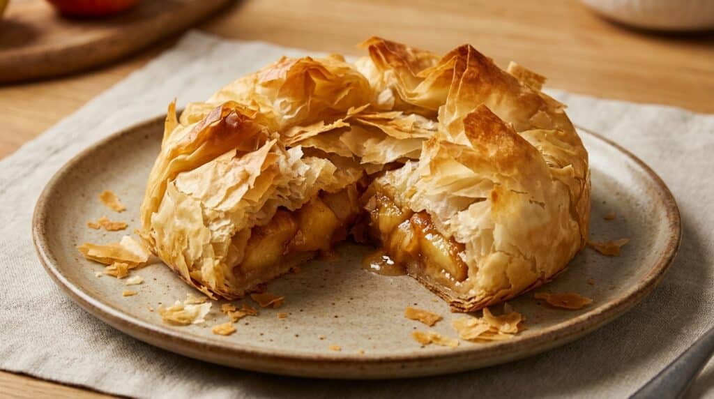 La réussite tient à deux choses : des pommes déjà légèrement travaillées à la poêle, et une pâte filo beurrée feuille par feuille pour obtenir un mille-feuille maison. Le four finit le travail en donnant une croûte dorée qui fait tout le charme de la croustade.