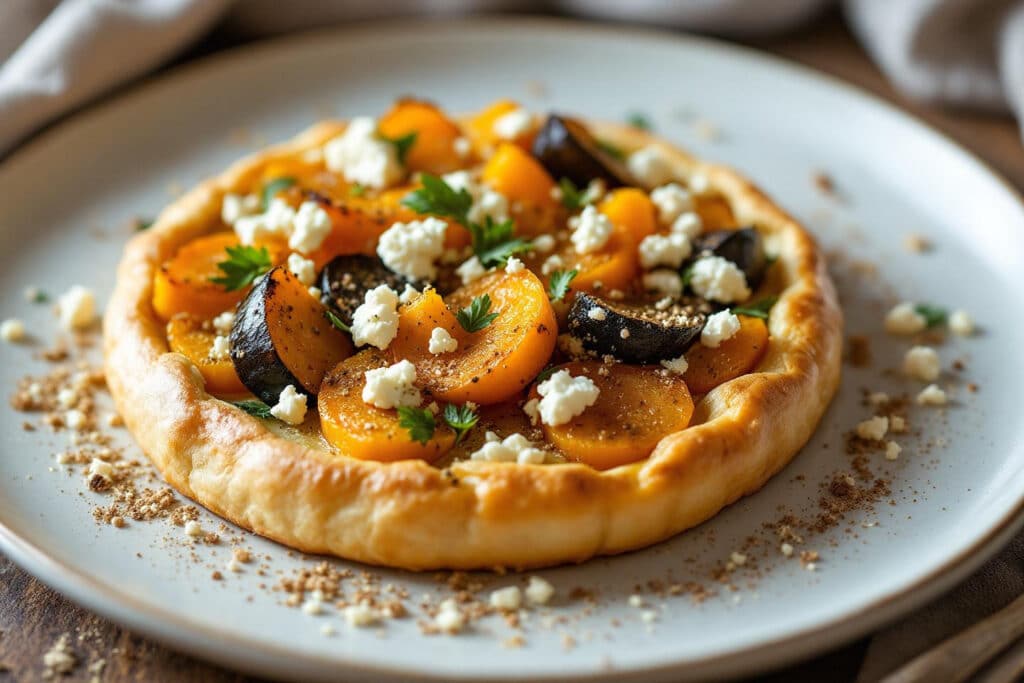 Pour que la tarte soit aussi belle que bonne, étalez les tranches de courge en éventail, légèrement superposées, et jouez sur les couleurs vives de la chair orangée. Parsemez généreusement la feta, puis saupoudrez le zaatar en pluie fine, pour qu’il épouse visuellement chaque recoin. À la sortie du four, un trait supplémentaire d’huile d’olive ou quelques feuilles de coriandre fraîche feront la différence pour une touche chic et végétale.