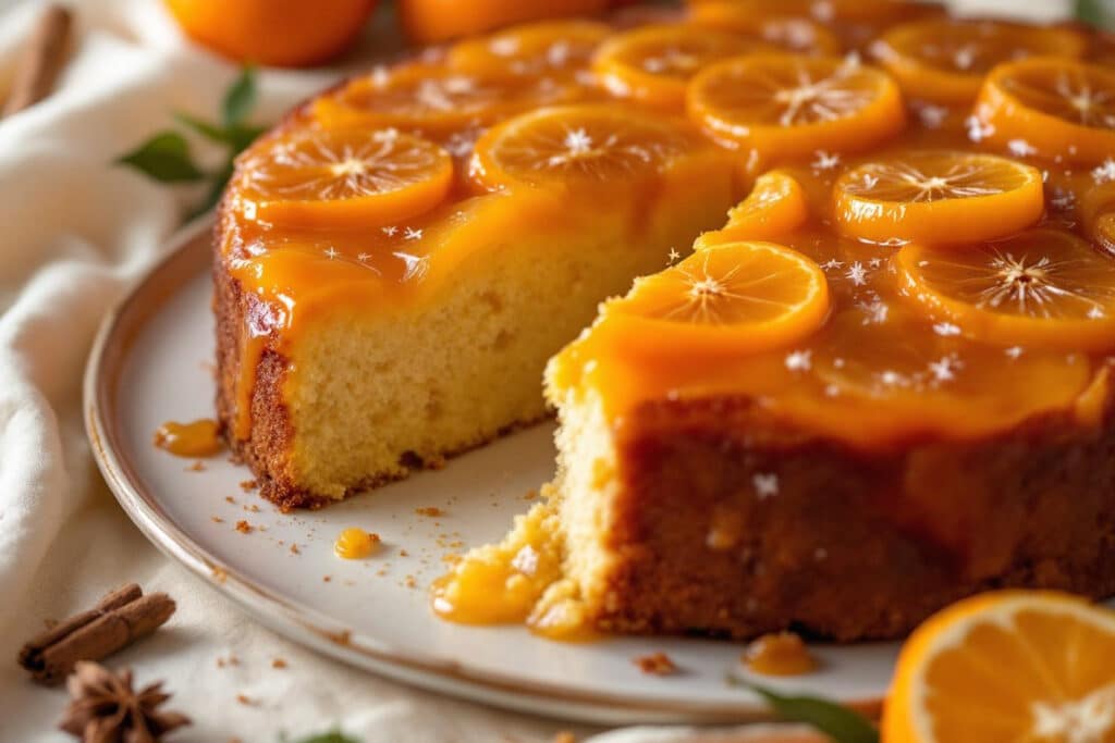 Il suffit alors de verser la pâte sur les fruits caramélisés, d’égaliser la surface et d’enfourner à 180 °C pendant 30 à 35 minutes. Le parfum généreux qui s’échappe du four annonce déjà la fête : la pâte devient légère, imbibée des jus d’agrumes, tandis que le dessous (qui deviendra le dessus) dore parfaitement. Au sortir du four, laisser tiédir 5 minutes avant de retourner le moule sur un plat de service : les tranches de mandarine, glacées de caramel, apparaissent alors telles des joyaux d’hiver sur fond doré. À déguster tiède pour un maximum de moelleux.