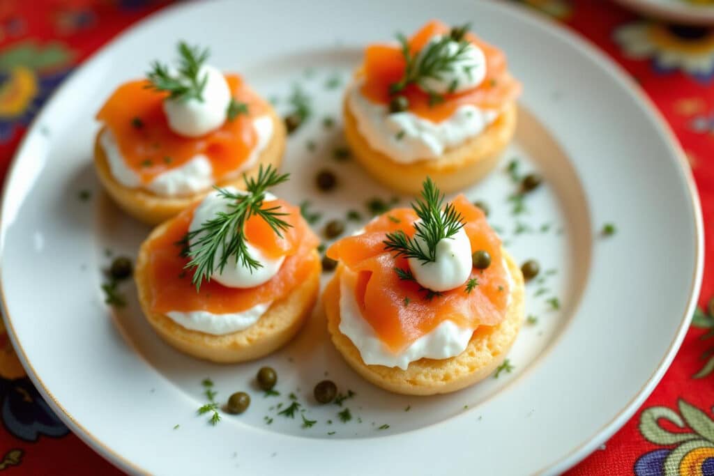 En plein cœur de décembre, ces mini blinis deviennent les rois de l’apéro dès lors qu’on les dispose sur une belle planche en bois ou un plat festif. Pour un effet chic et graphique, il suffit de varier les formes : quelques mini-blinis empilés, d’autres simplement alignés, les uns nappés de toppings et les autres nature, saupoudrés d’un voile d’herbes fraîches ou de baies roses. Un bol de crème citronnée, des brins d’aneth, deux-trois quartiers de citron et le tour est joué pour un buffet fait maison qui respire la générosité.