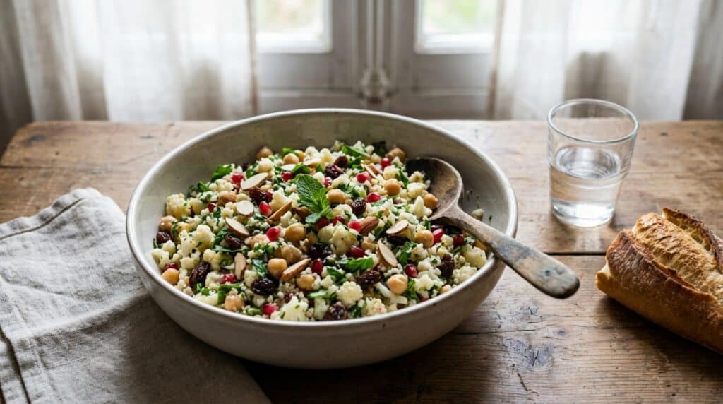 Ce qui fait la magie, c’est l’équilibre : le croquant du chou-fleur et des amandes, l’acidité du citron, le parfum des herbes, et une gourmandise discrète apportée par les raisins secs. Tout s’emboîte, et le taboulé prend un vrai relief, loin des versions un peu plates.