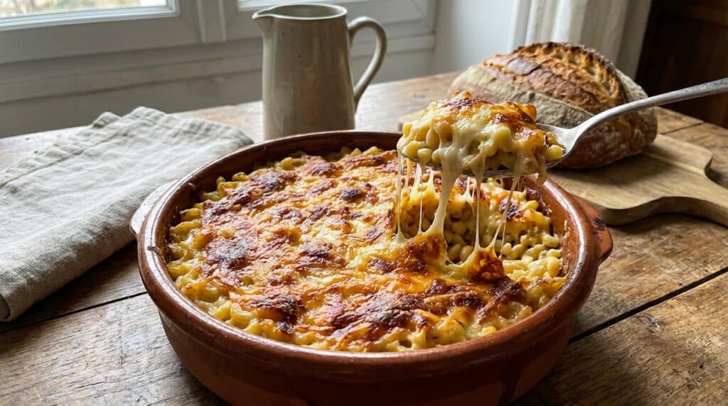 Verser dans un plat à gratin, répartir le reste de fromage dessus, et ajouter la chapelure si désiré. Enfourner à 200 °C pendant 15 minutes, jusqu’à obtenir une surface bien dorée et un intérieur filant.