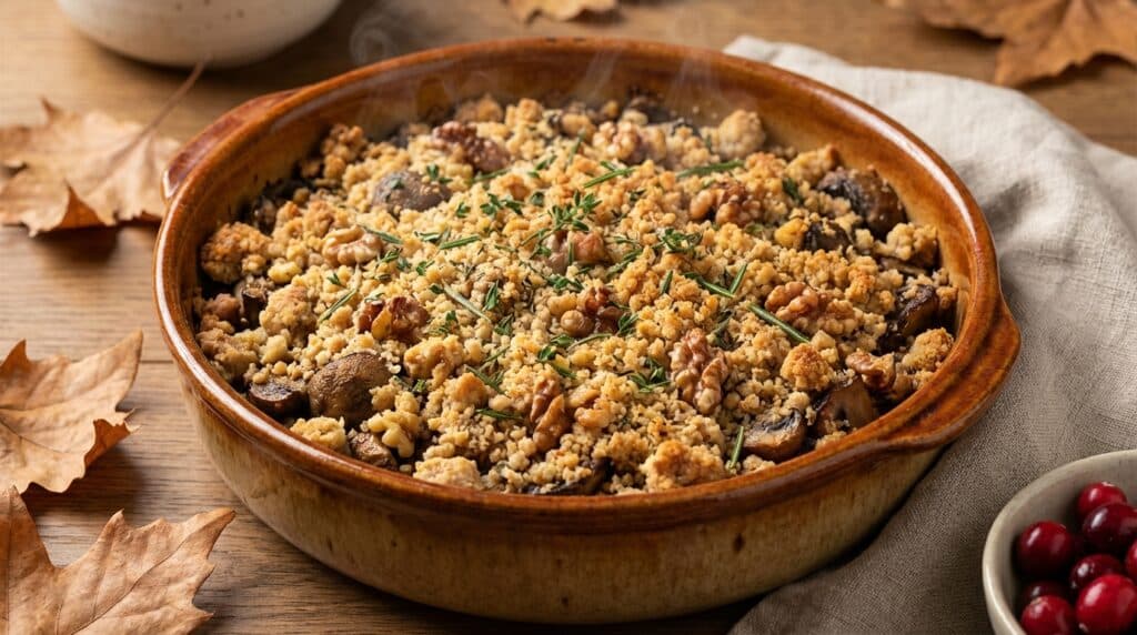 Pour varier les plaisirs, alterner les variétés de champignons selon l’arrivage du marché, remplacer une partie des noix par des noisettes ou des amandes, ou parsemer le dessus d’un zeste de citron finement râpé juste avant de servir : une touche acidulée intense qui sublime l’ensemble et prolonge la note festive jusque dans l’assiette.