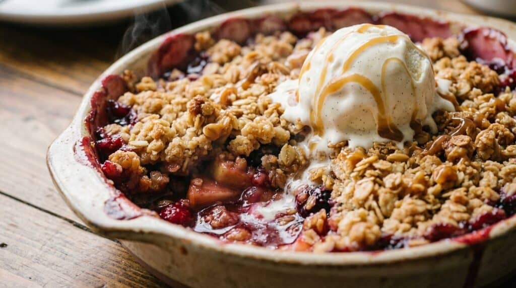 Lorsque le plat sort du four, dégageant des effluves de beurre noisette et de fruits chauds, l’aspect visuel est bluffant. On obtient une croûte dorée, texturée, aux allures bien plus sophistiquées qu’un simple crumble. Le contraste entre le fondant des fruits caramélisés et le croustillant des biscuits transformés crée une expérience gustative complète. Ce dessert de récupération peut être servi tel quel, encore tiède, ou accompagné d’une boule de glace vanille ou d’un nuage de crème fouettée pour les occasions plus festives.