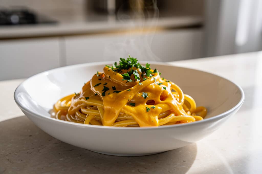 Le secret de cette pasta tient à la combinaison fromage fondu et lait, qui donne à la sauce une texture crémeuse et nappante digne des meilleures trattorias. Le persil vient réveiller l’ensemble d’une note herbacée bienvenue, tandis que la moutarde ajoute une pointe de relief qui titille agréablement le palais.