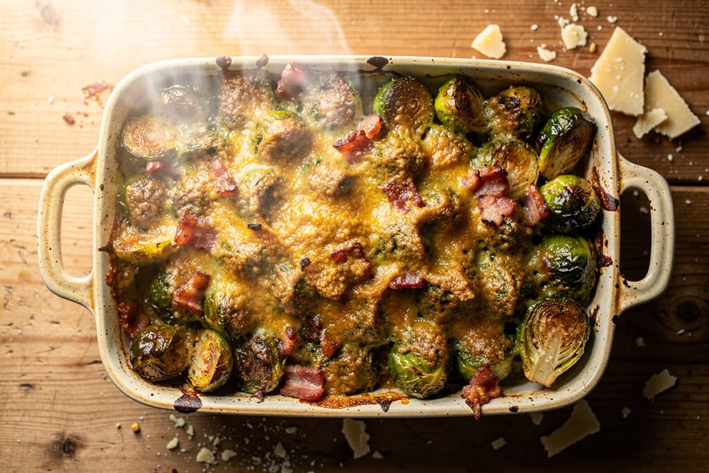 Grâce à l’onctuosité de la crème et au parfum réconfortant du parmesan, ce gratin rassure et fait des adeptes parmi ceux qui déclaraient ne jamais aimer ce légume. Quand le plat arrive à table, il n’est pas rare d’en voir certains se resservir par pure gourmandise, preuve que le chou de Bruxelles devient la vedette du repas d’hiver.