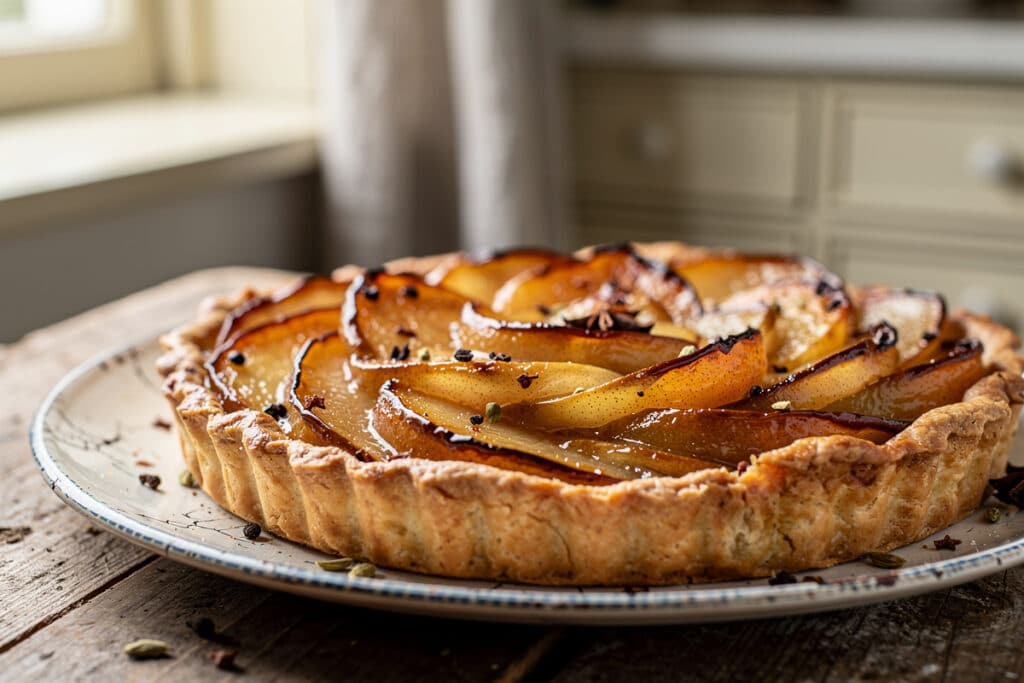 Au moment de servir, cette tarte peut s’enrichir selon l’inspiration : une cuillère de crème fraîche épaisse bien froide posée sur la part chaude, quelques gouttes de sirop d’érable ou, pour plus de gourmandise, une boule de glace artisanale à la vanille viennent parfaire l’ensemble. Le contraste entre la chaleur de la pâte et la fraîcheur des accompagnements apporte un plaisir renouvelé à chaque bouchée. Pour une touche festive, un peu de sucre glace tamisé au dernier moment rehausse la présentation tout en douceur.