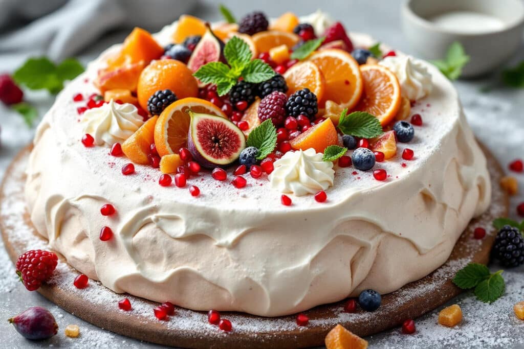 Une touche fruitée supplémentaire ? Servez la pavlova avec un coulis maison préparé à partir des mêmes fruits choisis pour la décoration, ou quelques éclats de pistache torréfiée. Les variantes sont infinies : osez la crème fouettée au mascarpone, un soupçon de zestes râpés dans la meringue, ou une base parfumée à la cannelle pour intensifier l’esprit festif. Pour la conservation, mieux vaut assembler la pavlova juste avant le service afin de préserver sa texture idéale. Non montée, la meringue se conserve 2 jours dans une boîte hermétique à l’abri de l’humidité ; les fruits et la crème gagnent à rester bien frais jusqu’au moment de la dégustation.