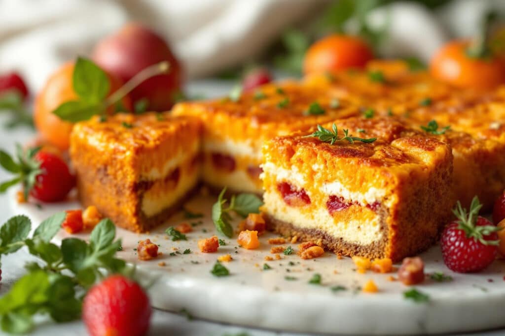 Ce cake doré s’apprécie aussi bien tiède que froid. Marié à une salade d’endives croquantes et quelques quartiers de pomme, il offre un duo de contrastes irrésistible. Pour les grandes tablées, il s’associe agréablement à une soupe veloutée au potimarron ou une salade de chou rouge vinaigré, enrichissant chaque bouchée de fraîcheur et de croquant. Un peu de confit d’oignons maison ou quelques figues séchées sur le côté, et l’assiette prend des airs de fête sans aucune difficulté.