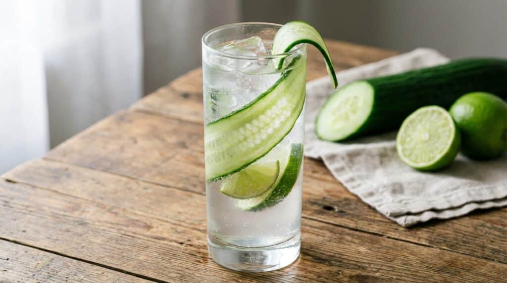 Compléter avec l’eau pétillante, versée lentement pour ne pas casser la mousse. Ce mélange de gin, jus de concombre frais, citron vert et eau pétillante permet d’obtenir un cocktail hivernal très léger, désaltérant et parfaitement adapté à la saison froide.