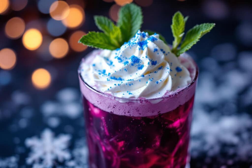 Ce qui transforme ce cocktail en véritable escapade hivernale ? La mousse chantilly déposée généreusement, comme un manteau cotonneux sur la boisson, puis le saupoudrage de sucre bleu, clin d’œil féérique à la légende des neiges et aux lumières de Noël. Effet waouh garanti, surtout à la lueur des bougies ou autour du sapin.